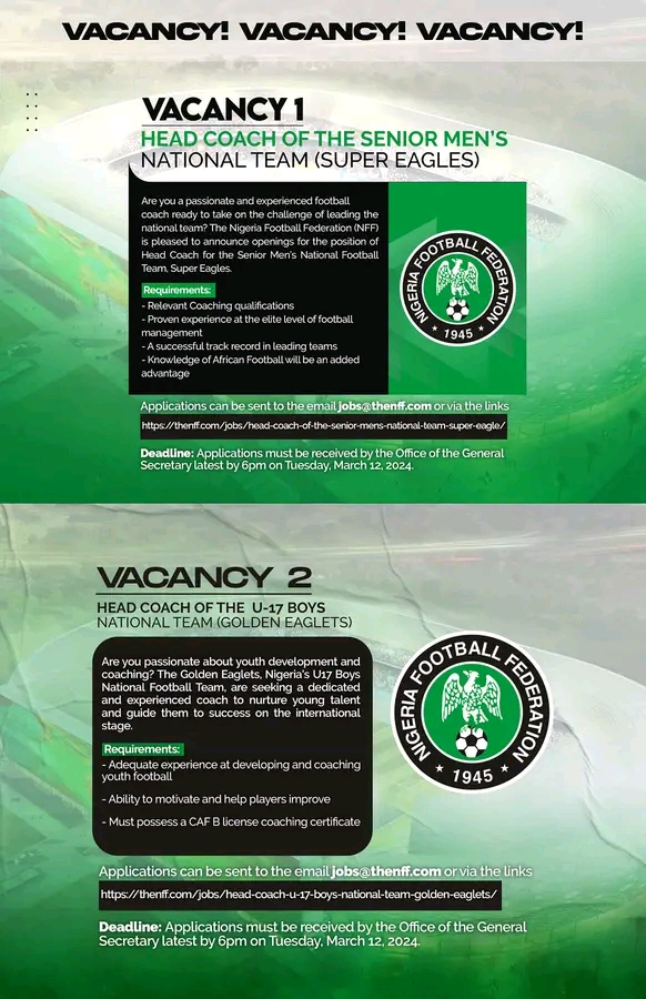 Are you a passionate and experienced football coach ready to take the challenge of leading the national team?.The Nigeria football federation is pleased to announce openings for the position of Head Coach for the Senior Men’s National Football Team Super Eagles.